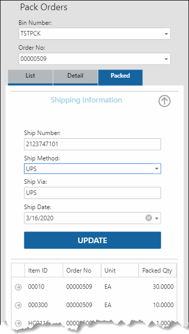 If you have shipping information, you can expand the Ship Information section and enter the shipping number and method. Tap Update to update the sales order with the shipping information. NOTE: The Ship function on the Pick/Pack/Ship menu performs the same function: updating the ship-to information on the sales order.