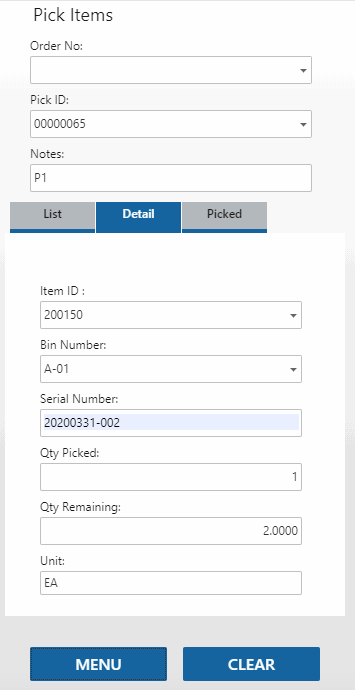 Tap on the line item you want to pick. The Detail tab will show the item you are picking. Scan or enter the lot number and/or serial number as applicable. TIP: If you are picking a serialized item, the bin number will automatically fill in once you have selected a serial number. Accept or enter the Qty Picked. The Qty Remaining is the quantity of items left to pick. This number will be accurate once you have tabbed through to the Picked tab.