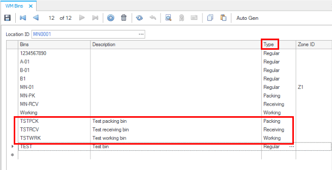 Use the Bins function on the WM Setup and Maintenance menu to create test bins and assign them the bin types of packing, receiving, and working.