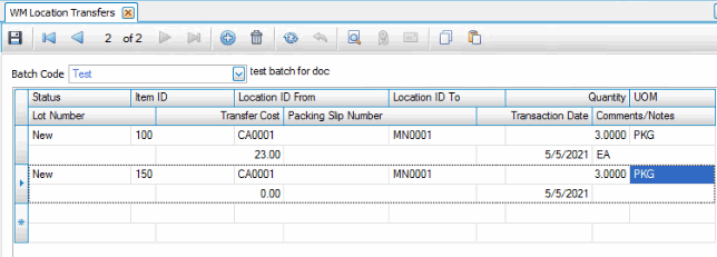 Select the transfer batch in the Order No drop-down list. The items on the location transfer are listed.