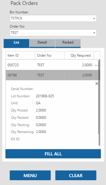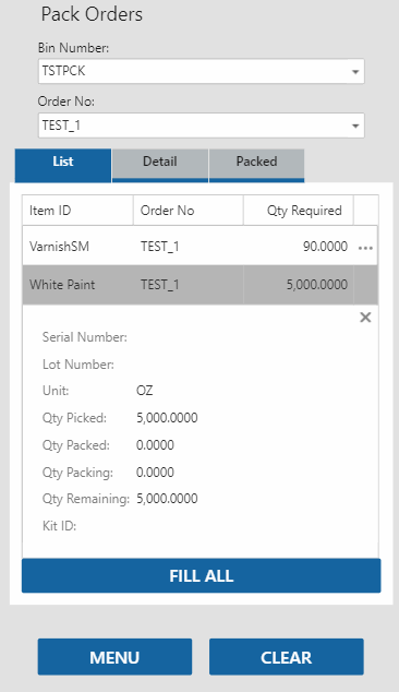 Select an item to pack/issue. The Detail tab will open. Enter the number of items you are issuing/packing in the Qty Packing field, then tab out of the field. The item will be added to the list on the Packed tab. Alternately, tap the Fill All button to pack/issue all items at once.