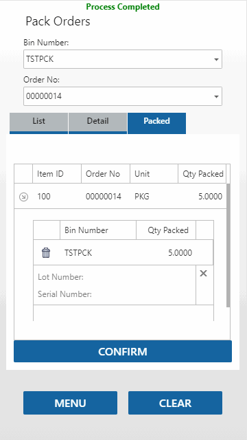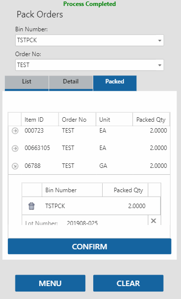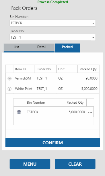 When all items are filled/packed, open the Packed tab and tap the Confirm button to complete the process.