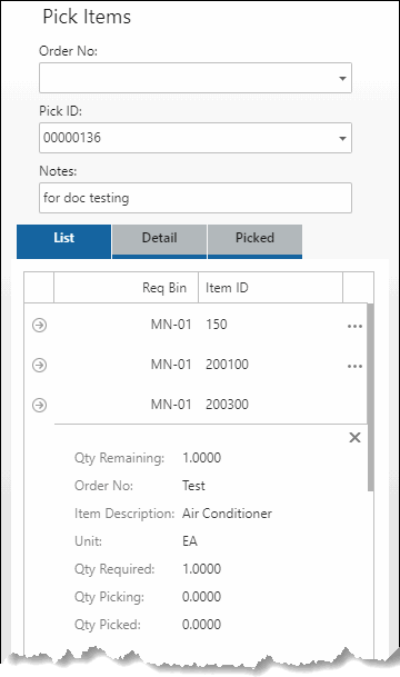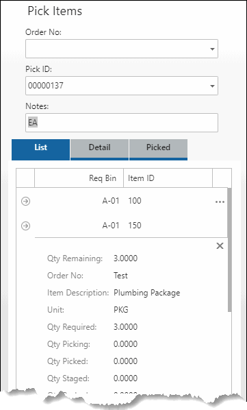 Pick the items for the project using the Items function on the Pick/Pack/Ship menu. Scan or select the Pick ID number or Order No you want to pick. The items on the list or order will appear on the List tab. Select a line item to pick.