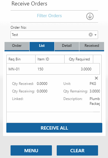 Select the Receive Orders function on the Receiving menu to receive the items.