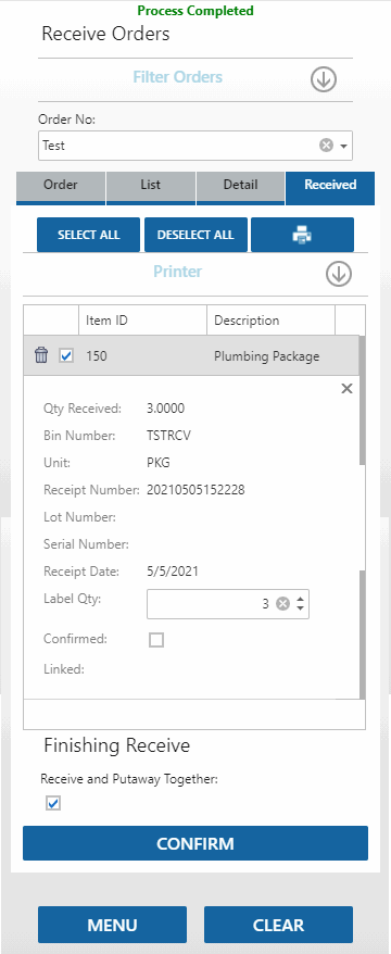 When you have finished receiving the order, tap the Confirm button. Once the order is confirmed, a green notification will appear at the top of the screen.