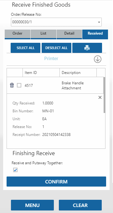 After the confirm process, if you left the Receive and Putaway Together check box blank, use the Put Away function on the Receiving menu to put the finished goods into stock.