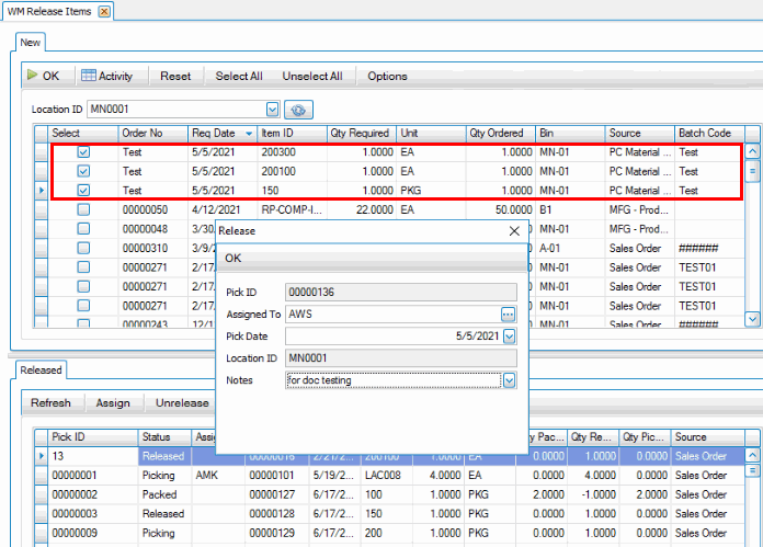 Releasing the items creates a pick ID you can use to print a picking list.