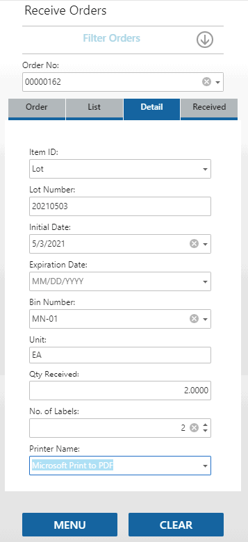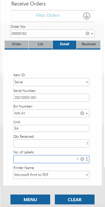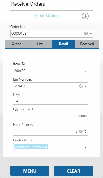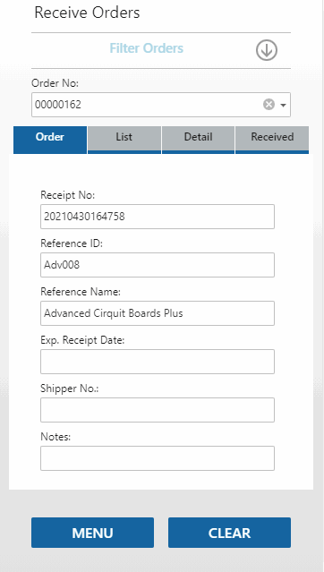 The function will return to the Order tab with a blank Order No. field, allowing you to receive the next order.