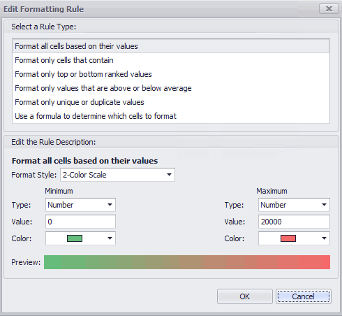 3. Establish the format style and range for the cell values to format. In our example, we are choosing a 2-color scale. The range, by number, is from 0 to 20,000 ($0 to $20,000). We will keep the default green (low) to red (high) color scale.