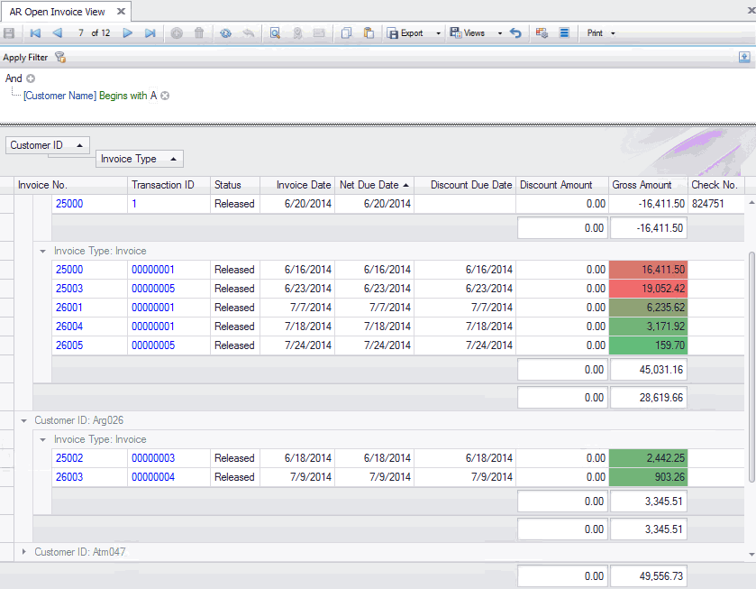Using the AR Open Invoice View, we want to have a visual reference for the invoice amounts. We will do this using conditional formatting.