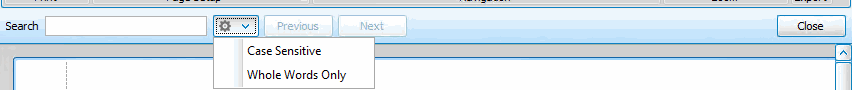 The Search bar on the Print Preview screen allows you to search the report for a value. You can restrict the search by choosing to match the case of the search term (Case Sensitive) or matching only the entire word (Whole Words Only).